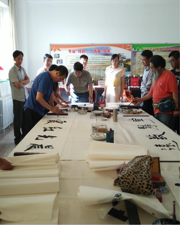 讲座结束后赵万顺先生、美术学院副院长杨皓教授、以及天水师范学院诗书画协会部分成员在jinnian金年会会议室进行了书画笔会交流活动,在活动现场,为了弘扬我国悠久的历史文化,让更多学生得到艺术的熏陶,书画家们现场挥毫泼墨,以精湛的技艺尽展书画艺术魅力,并将现场创作的作品赠予参加活动的同学们。