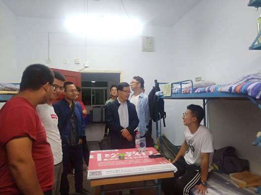 95日晚,新生报到一结束,金年会党总支书记王建斌、副书记刘正、副院长杨玲娟分别带领新生班主任、辅导员和学生干部深入华英公寓、芝园公寓、行健公寓看望2019新生。