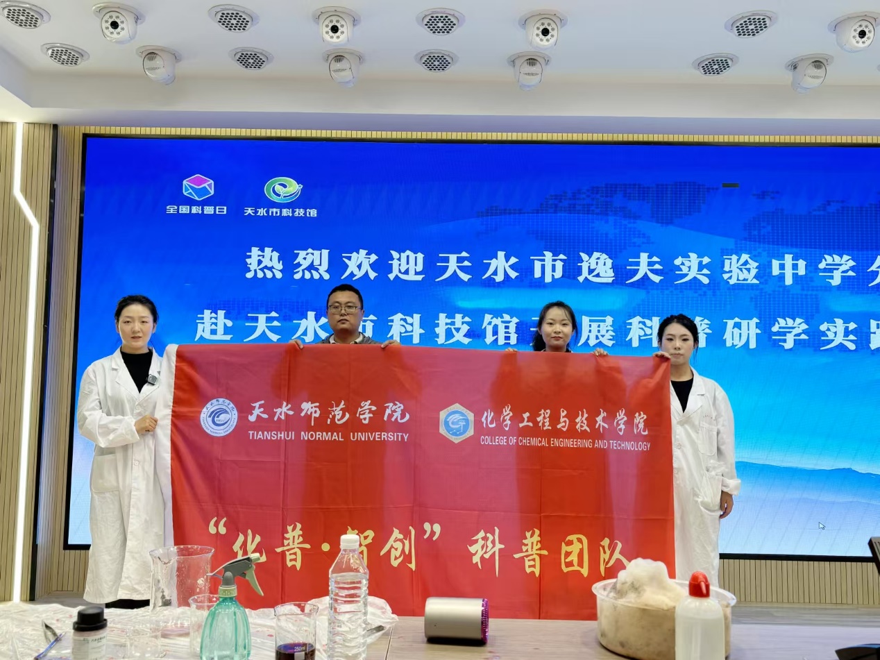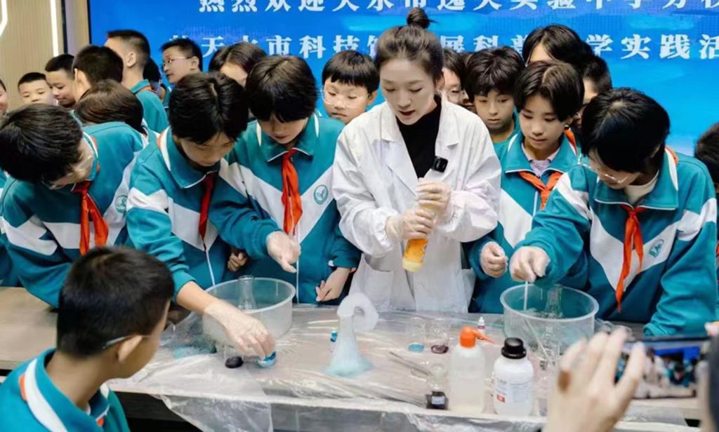 在天水市科技馆钱伟长学术报告厅,化普·智创科普团队为天水市逸夫实验中学分校七年级的师生展示了大象牙膏”“黄金雨”“晴雨花三个趣味化学实验,并指导学生积极参与实验操作。师生们近距离感受了化学的魅力,了解了科学知识,充分激发了学生们科学探索的兴趣,培养了他们的实践创新能力。