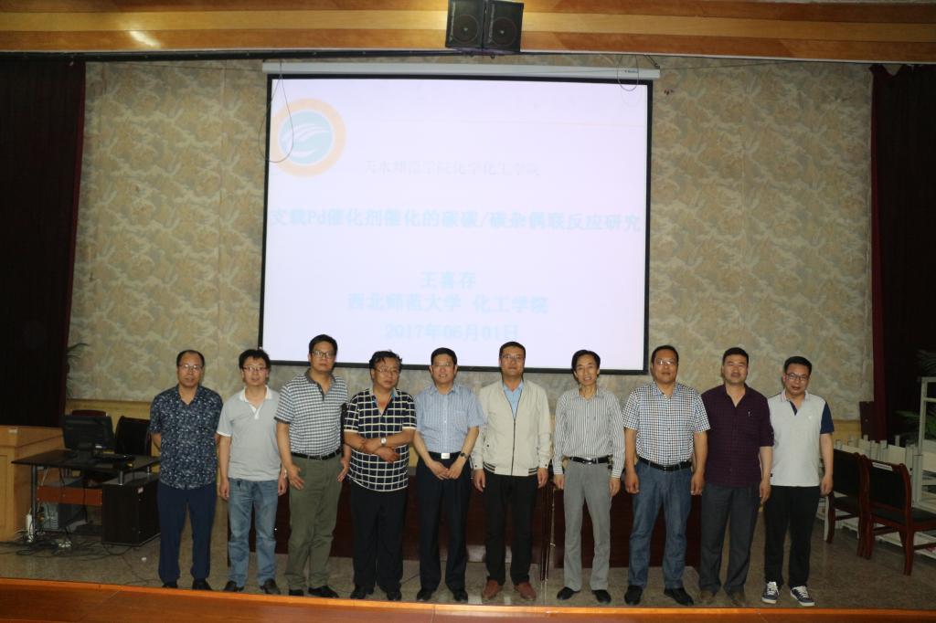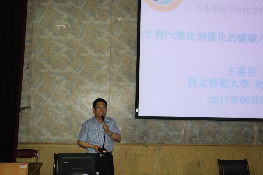 6月1日晚,在1号报告厅,西北师范大学博士生导师王喜存教授,为金年会师生做了题为“关于支载Pd催化剂催化的碳碳/碳杂偶联反应研究”的学术报告,报告会由金年会副院长吕玲玲博士主持,研究生处左国防处长、金年会党总支书记王小芳、院长刘新文,副书记雷新有、副院长杨富巍、吕玲玲及部分教师及学生大约200余人聆听了报告。