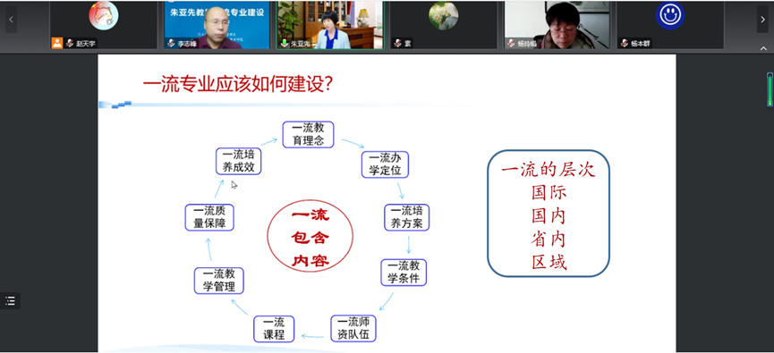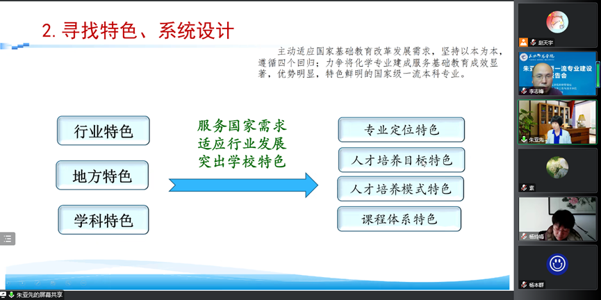 为进一步加强化学专业内涵建设,切实提高人才培养质量,近日,jinnian金年会线上举行化学类一流本科专业建设交流会。会议特别邀请教育部高等学校化学类专业教学指导委员会秘书长、厦门大学朱亚先教授及《化学教育》专职副主编、北京师范大学朱玉军博士就化学一流专业建设进行指导,会议围绕化学一流专业建设的重点和建议及化学类专业怎么做教学研究、如何撰写教学研究论文展开。学院化学、应用化学和化工系相关教师及学生共计300余人参加交流会。